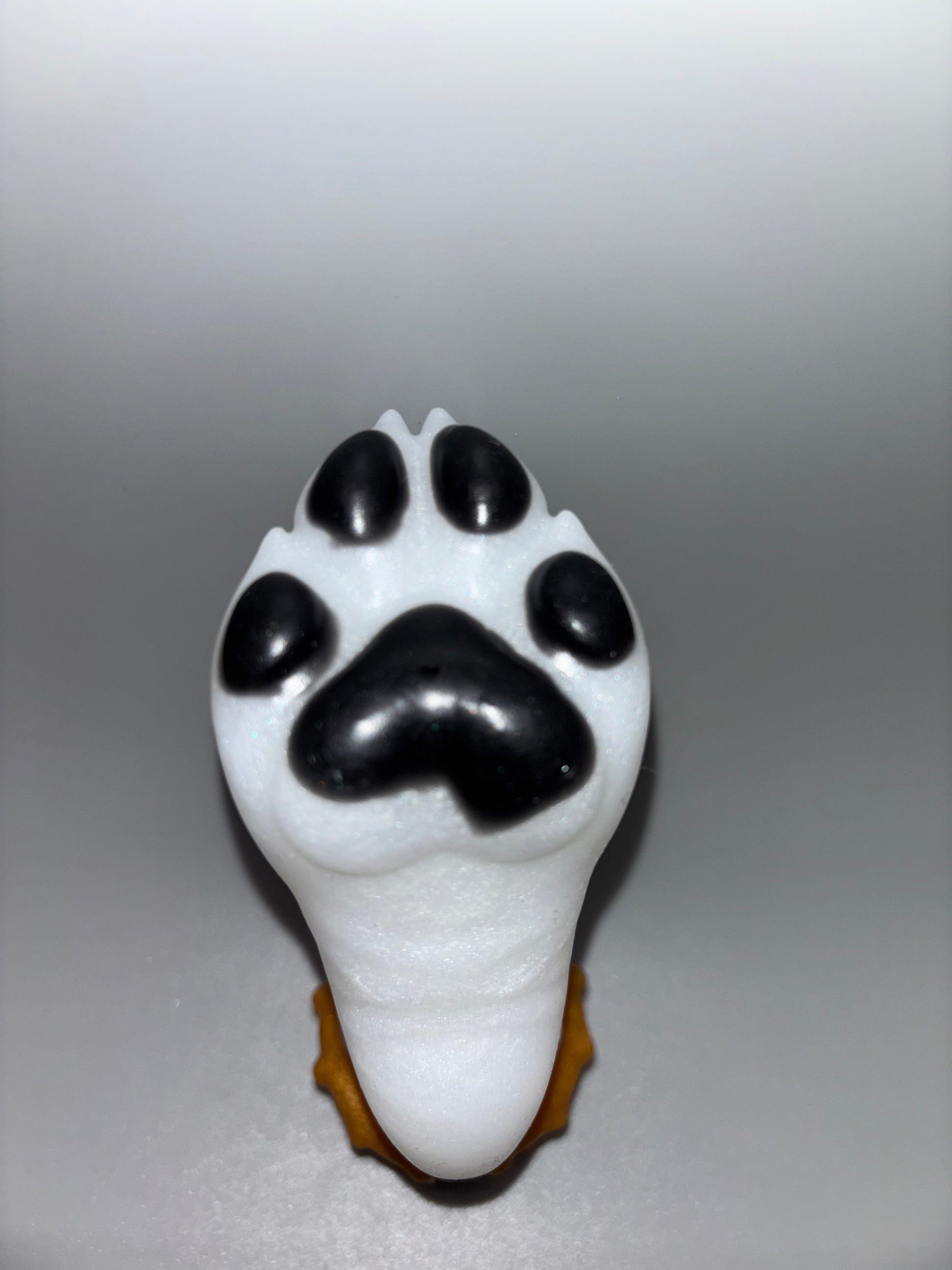 3-Cerberus Paw Small BLACK BEANS FLOP-A shimmery white paw with black toe beans and gold cuff and chain with a black band. GITD. DISCOUNTED for bubbles on the beans/pads. SOFT firmness