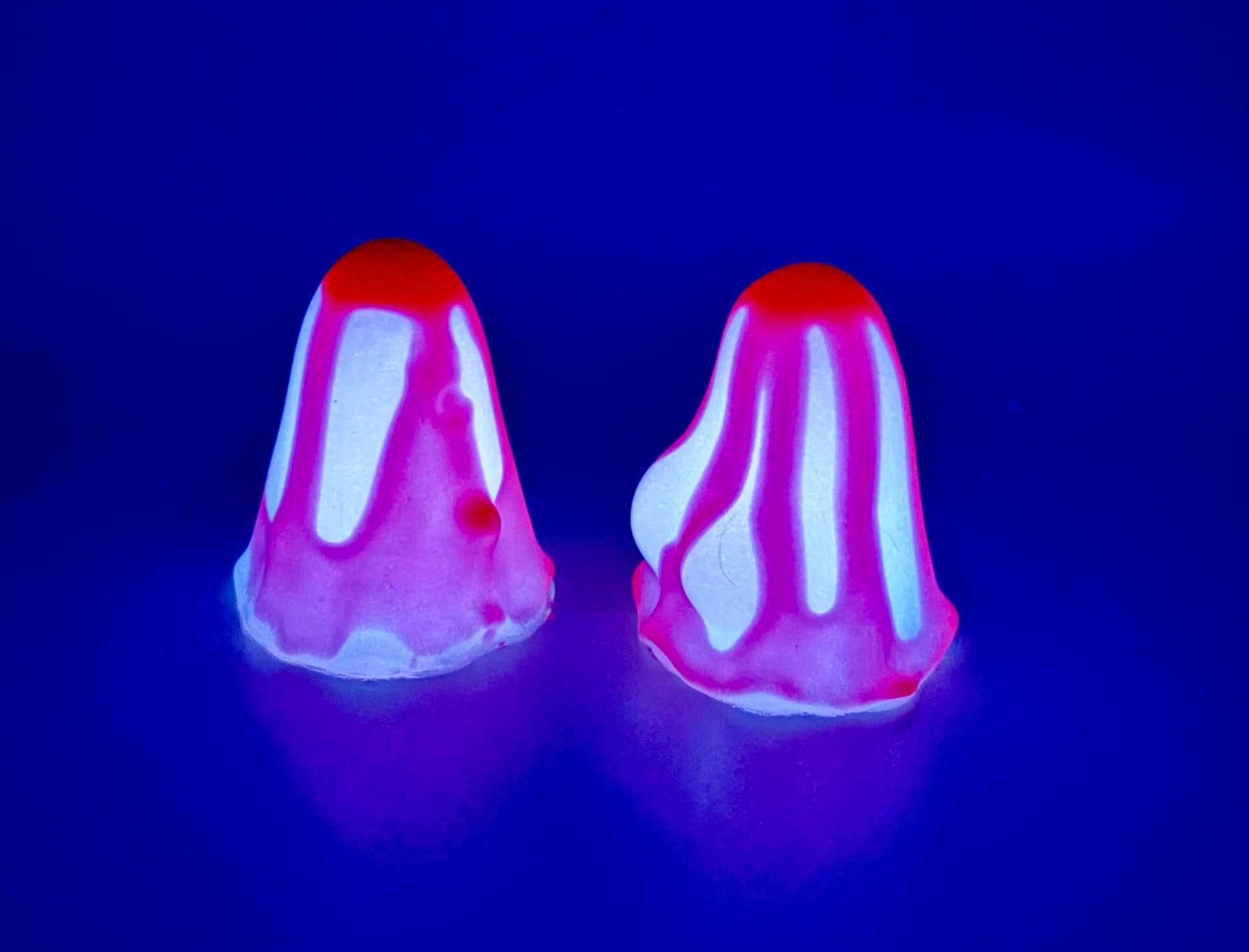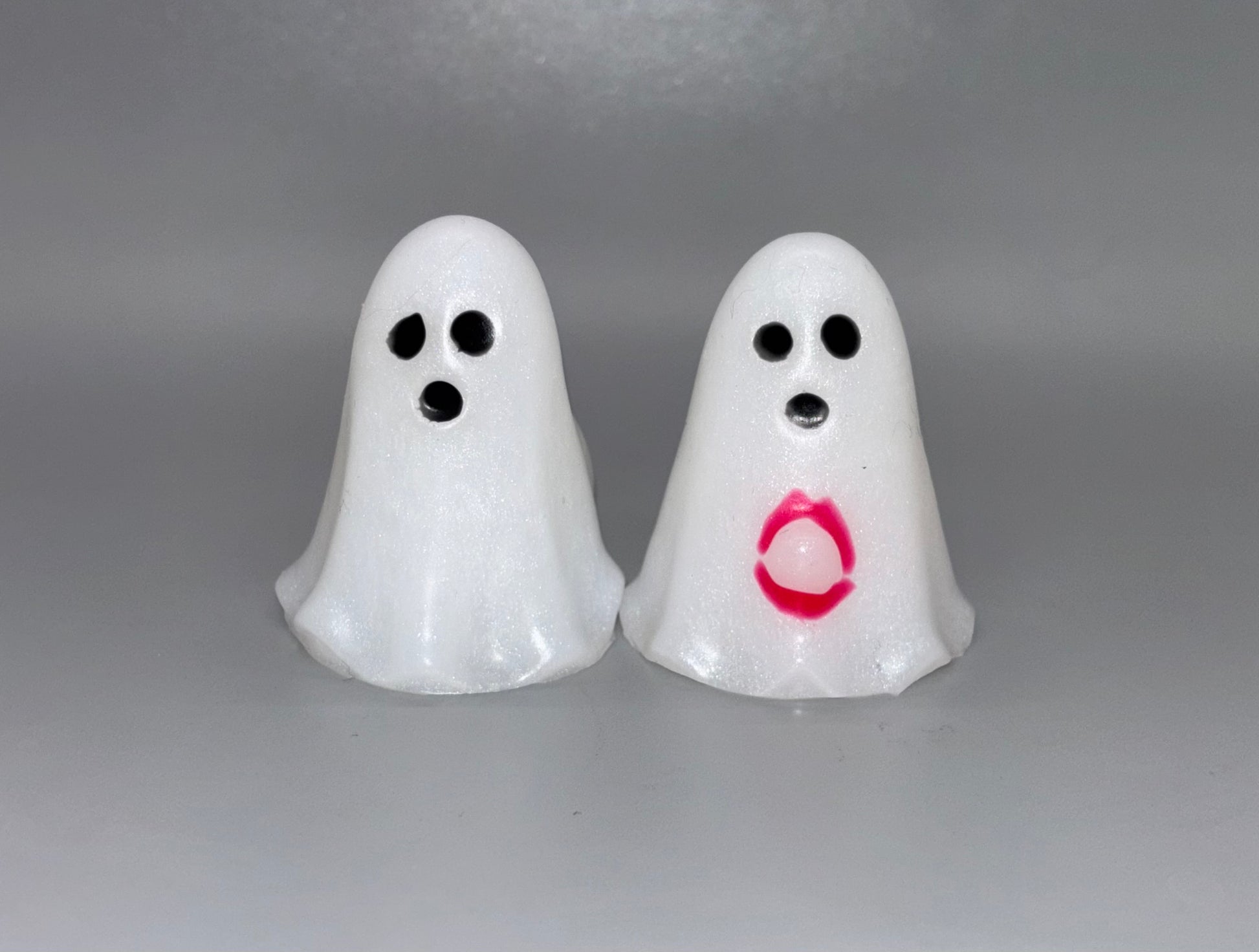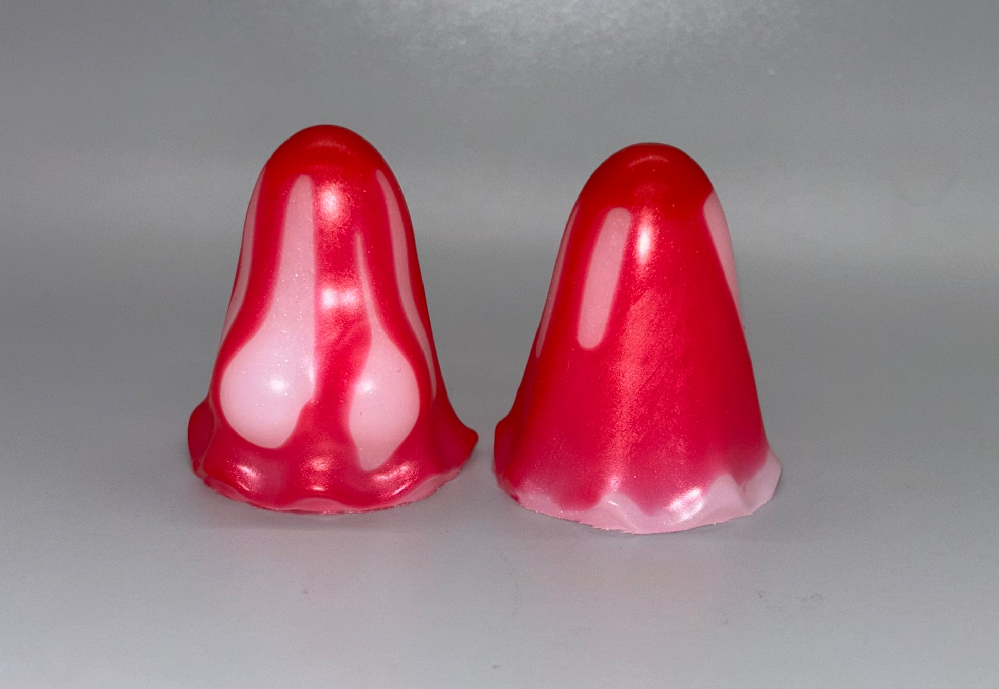 17-Cheeks & Randy SLASHER-Bright red drips of blood over shimmery white bodies. GITD. SOFT/MEDIUM SPLIT firmness. Drips are Medium. Ghosts are Soft.