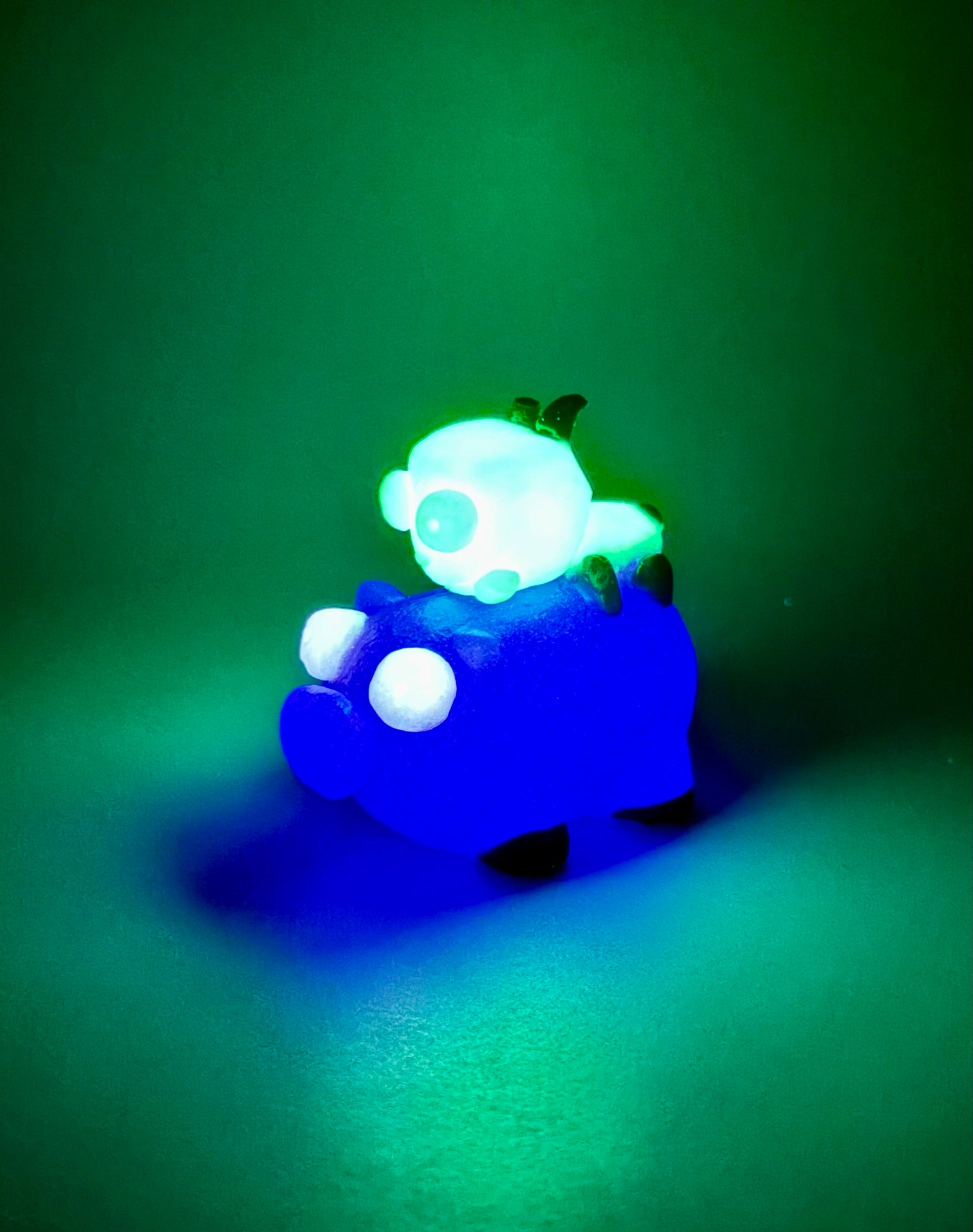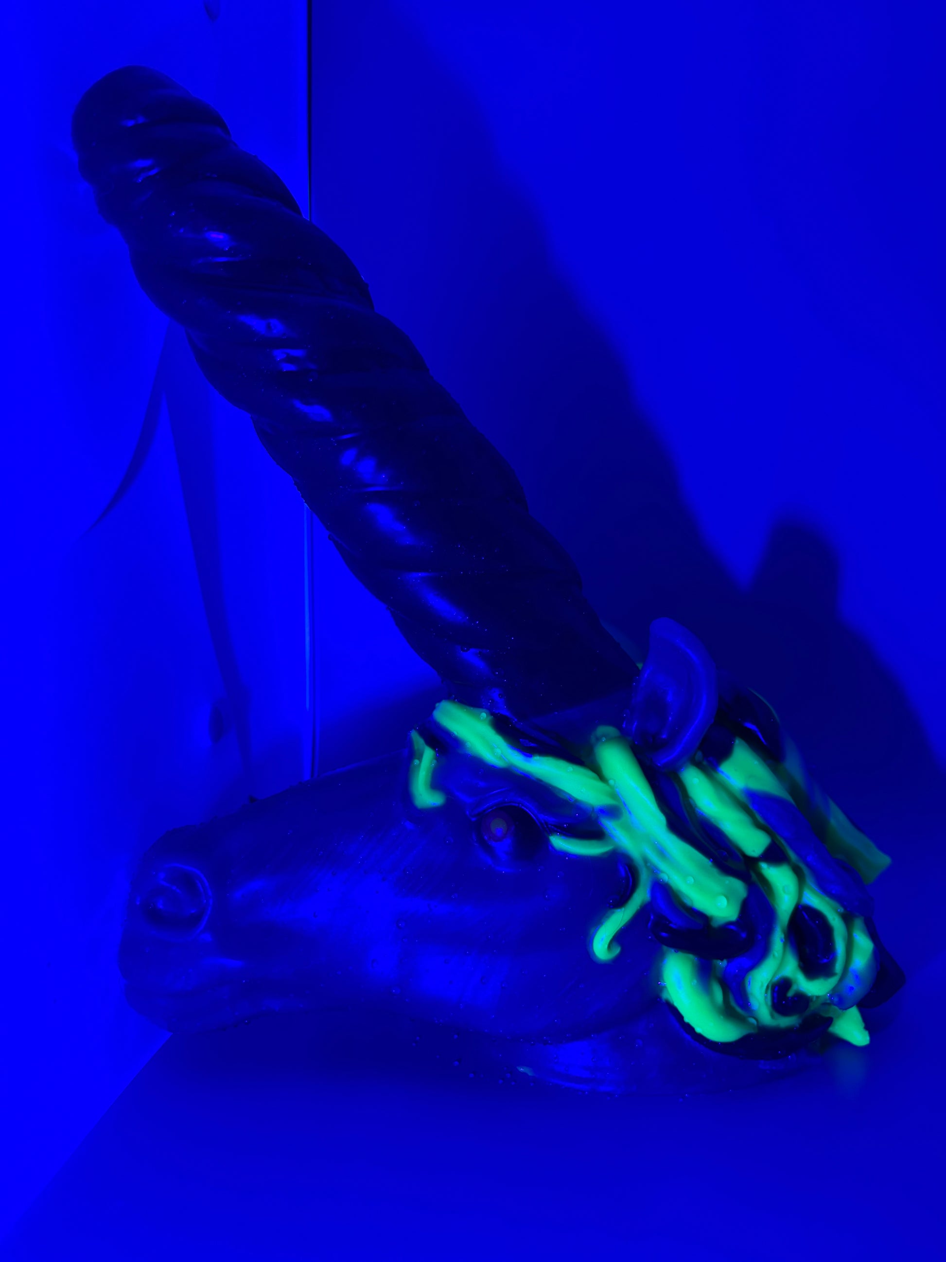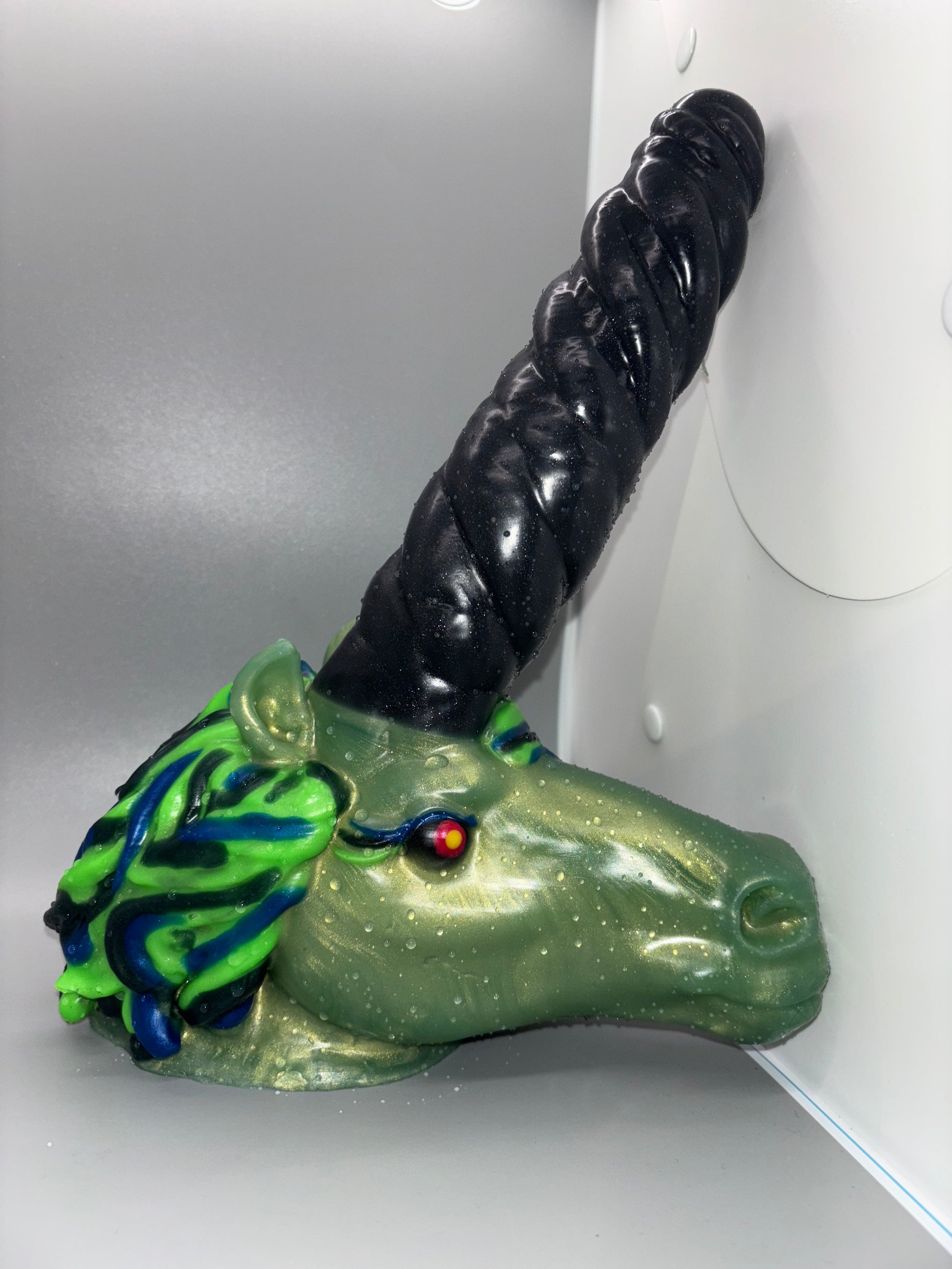 15-Resurrection Large KELPIE-A kelpie inspired design. Dark blue, swamp green, and bright green hair with a sparkly black horn and a shimmery, grass green face. GITD/UV. SOFT/MEDIUM SPLIT. Horn and hair are soft. Head is medium. DISCOUNTED for a few tiny air bubbles in hair. Does not affect use.Β