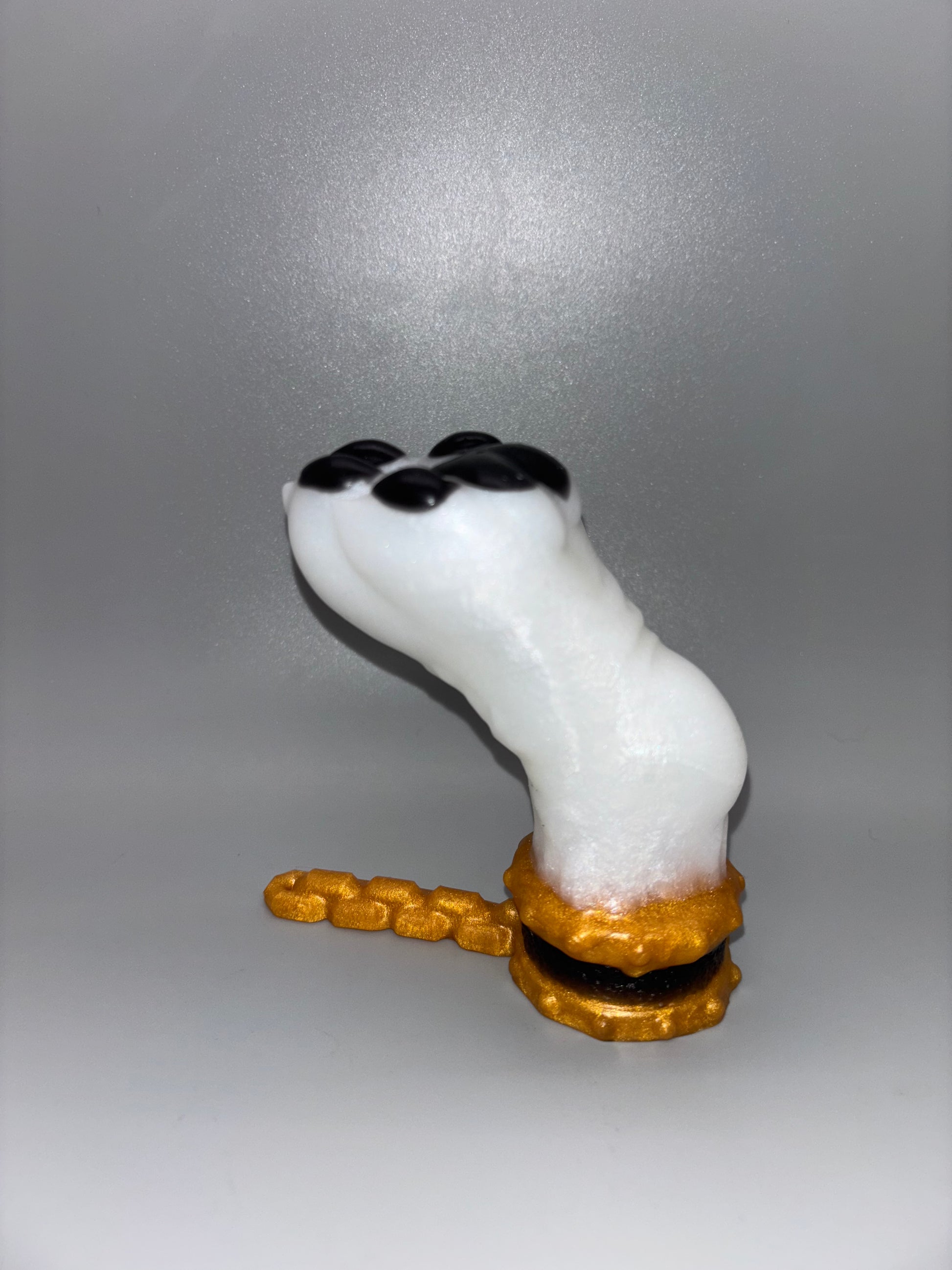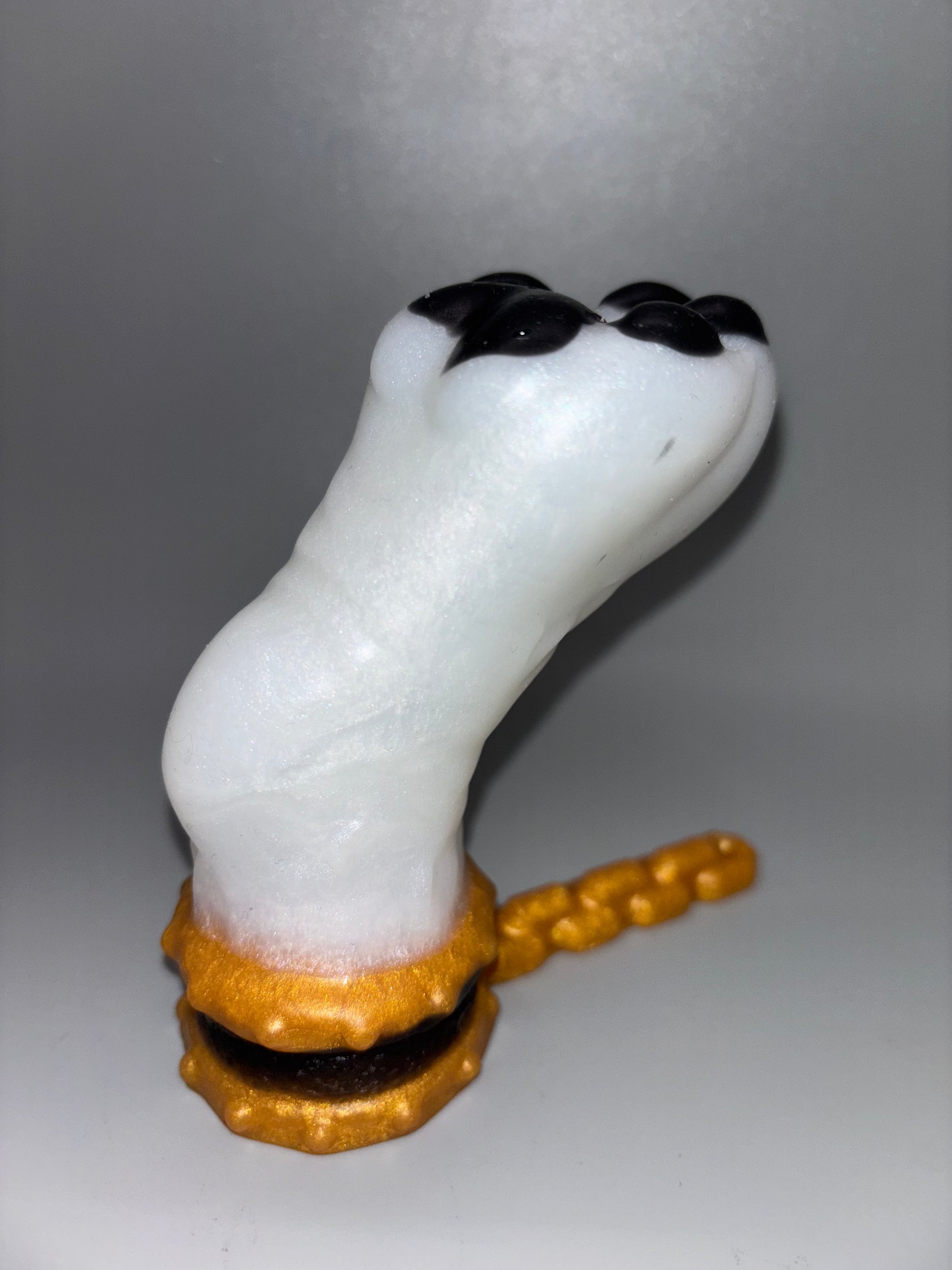 1-Cerberus Paw Large BLACK BEANS FLOP-A shimmery white paw with black toe beans and gold cuff and chain with a black band. GITD. DISCOUNTED for bubbles on the beans/pads. SOFT/MEDIUM SPLIT firmness-Soft beans/pads and cuff. Medium paw.
