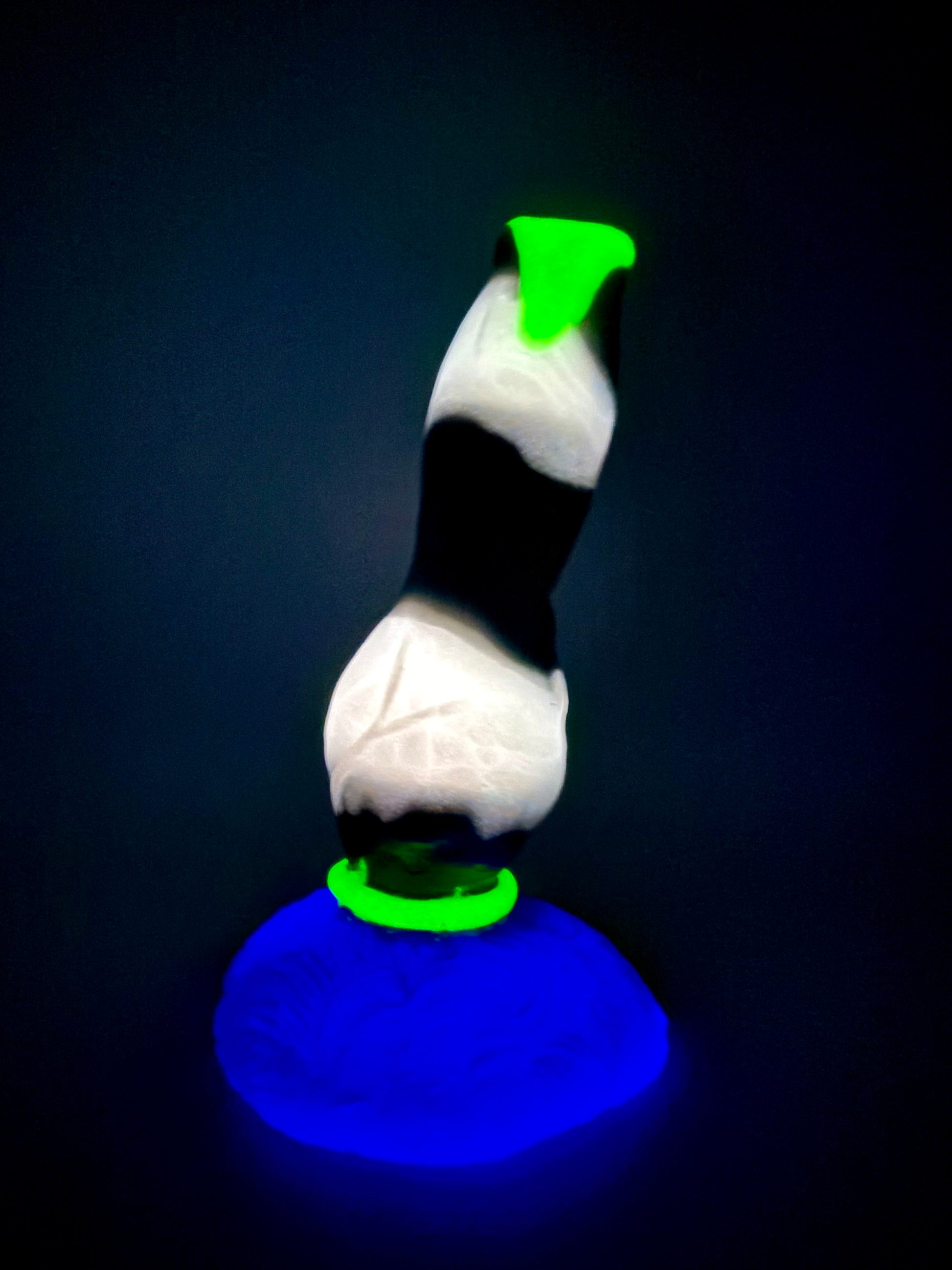 12-Lycaon SANDWYRM-A bright green drip down a black and white striped shaft with a bright green ring and purple base. GITD/UV. MEDIUM firmness