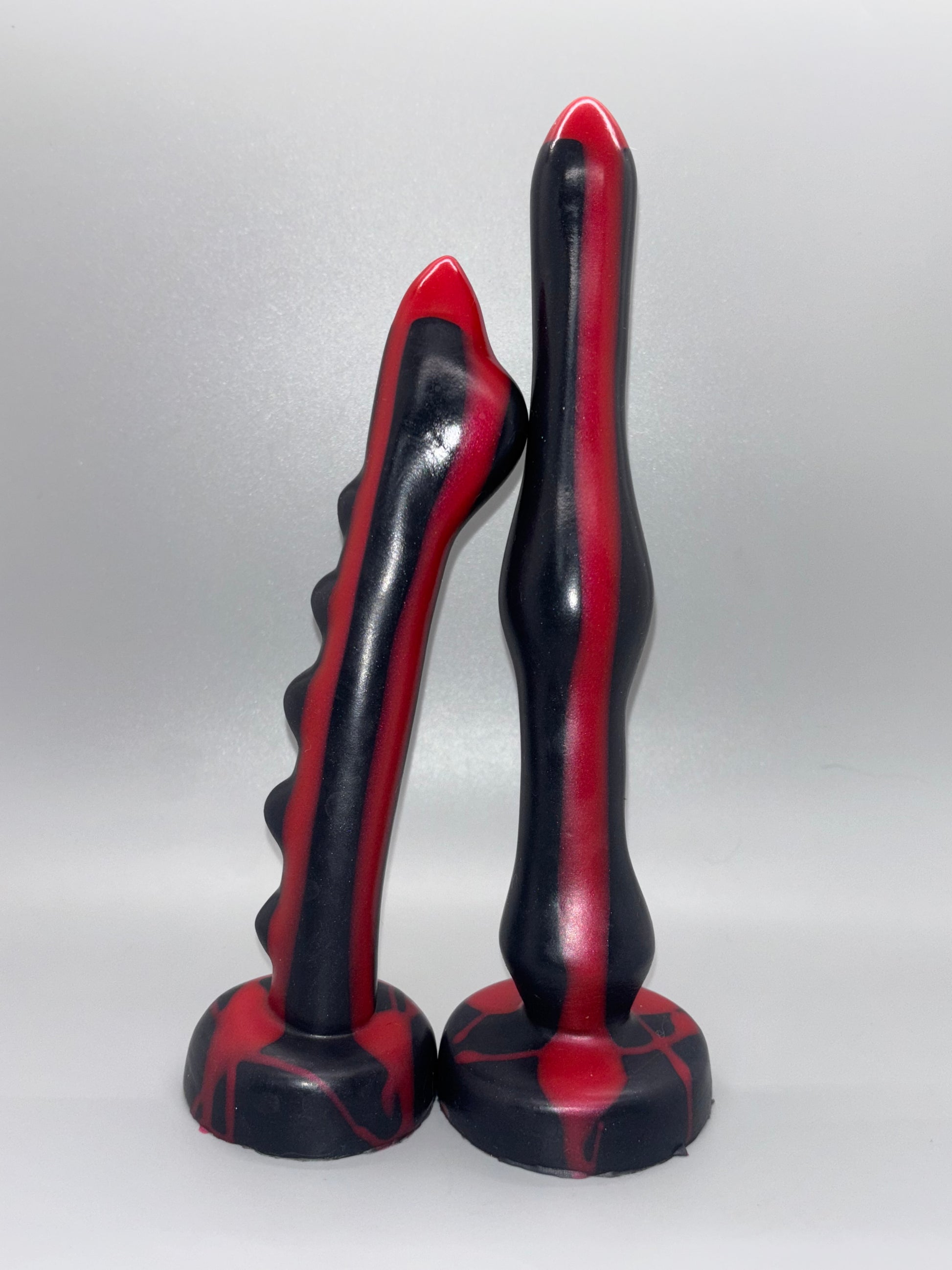 14-Stenops and the Wand of Destiny Combo MIDNIGHT SLASHER-Bright red drips over a sparkly black shaft and base. Matching. GITD. MEDIUM/FIRM SPLIT firmness. Drips are medium. Shaft and base are firm.