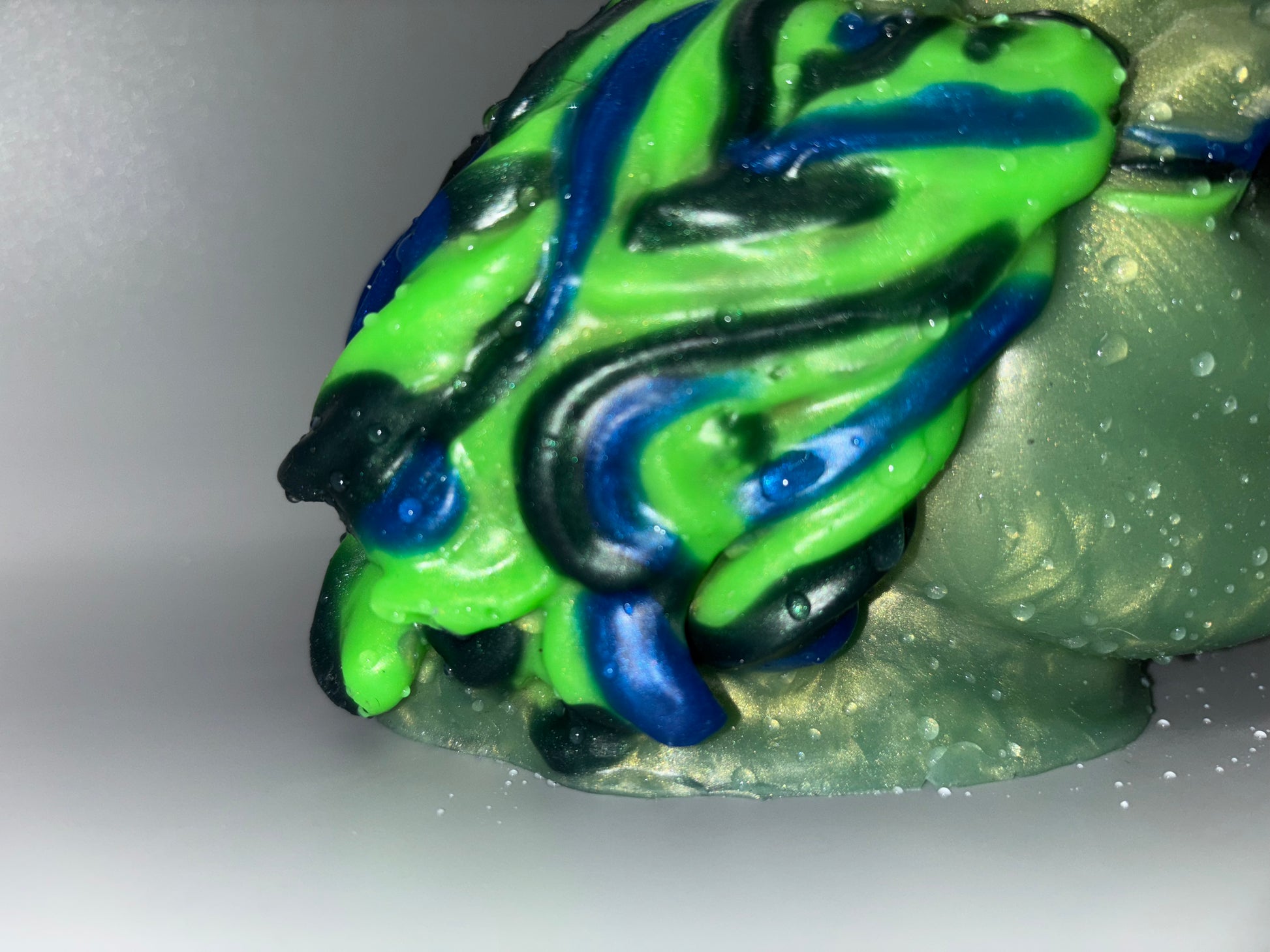 5-Kith Small GREEN SANDWYRM FLOP-A dark green nose and tongue, bright green lips and freckles, and a black and white swirled snoot. GITD. DISCOUNTED for a couple of tiny bubbles on lip. SOFT firmness